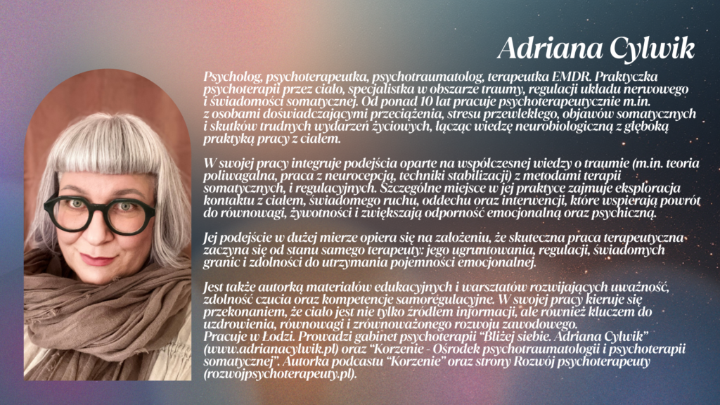 Dowiesz się, jak somatycznie zamykać kontakt z pacjentem, regulować pobudzenie po trudnym materiale i wracać do własnego rytmu. To oznacza mniej ruminacji, mniej napięcia po pracy i większą dostępność dla życia poza gabinetem.