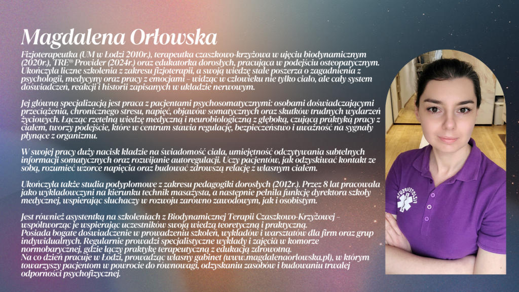 Zamiast wchodzić w sesję z napięciem lub pośpiechem, będziesz wiedzieć, jak szybko sprawdzić swój stan autonomiczny i wyregulować się przed kontaktem z pacjentem. Przekłada się to na spokojniejszy początek sesji i większe poczucie bezpieczeństwa po obu stronach.