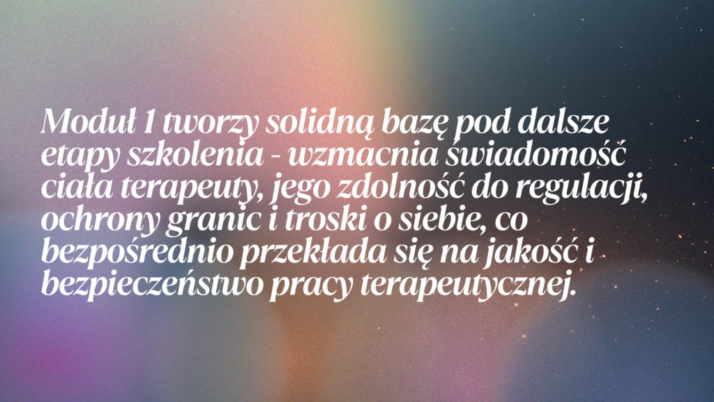 Udział w Module 1 to inwestycja w Twoją stabilność, bezpieczeństwo i długofalową odporność jako terapeuty. Szkolenie zostało zaprojektowane tak, aby realnie wspierać Cię w codziennej pracy – nie tylko na poziomie wiedzy, ale przede wszystkim doświadczenia i ucieleśnionych umiejętności.
