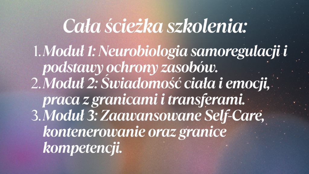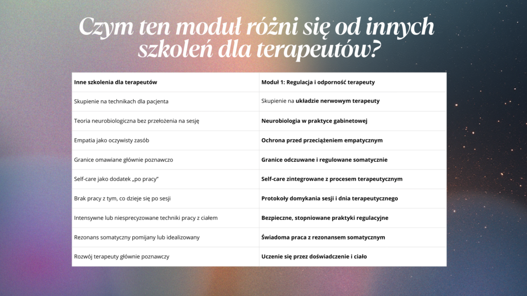 Ten moduł wyróżnia się tym, że nie uczy, jak być „lepszym terapeutą kosztem siebie”, lecz jak być terapeutą, który potrafi pozostać obecny, stabilny i odporny – bez rezygnowania z własnego dobrostanu.